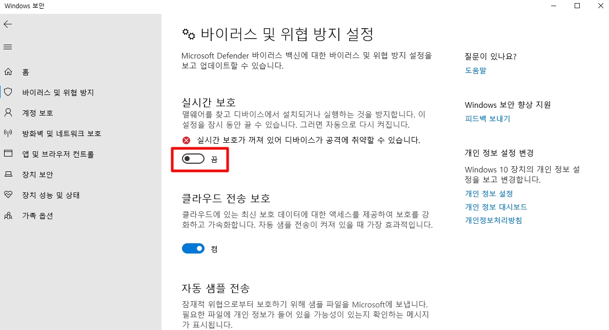 [실시간 보호]항목을 아래 그림과 같이 [끔]으로 변경합니다.