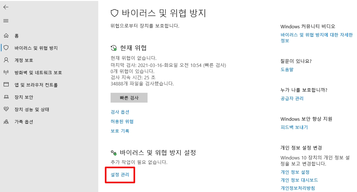 [바이러스 및 위협 방지 설정] 항목의 [설정 관리]를 클릭.