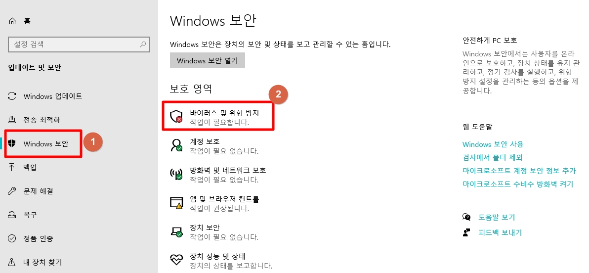 [Windows 보안]-[바이러스 및 위협 방지]로 들어갑니다.