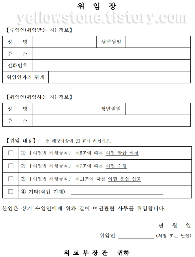 그리고 어린이 여권발급을 보호자가 아닌 제3자가 하는 경우엔 여권발급신청용 위임장이 있어야 하는데 이 양식 또한 같이 첨부하니 필요하신 분은 사용하시길 바란다.