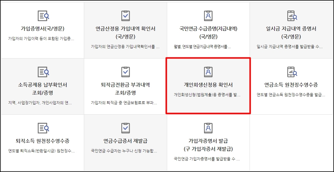 개인회생 신청 시 필요한 서류는 급여소득자와 영업소득자의 제출 자료가 조금 다르지만 채무자의 재산목록, 개인회생채권자목록, 근로소득원천징수 영수증 또는 급여를 주는 회사가 발급하는 급여명세서 또는 소득증명서 등이 있는데 오늘 설명할 국민연금 개인회생 신청용 확인서는 국민건강보험자격득실 확인서와 함께 급여소득자와 영업소득자가 공통으로 제출해야 할 자료이다.