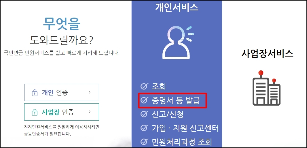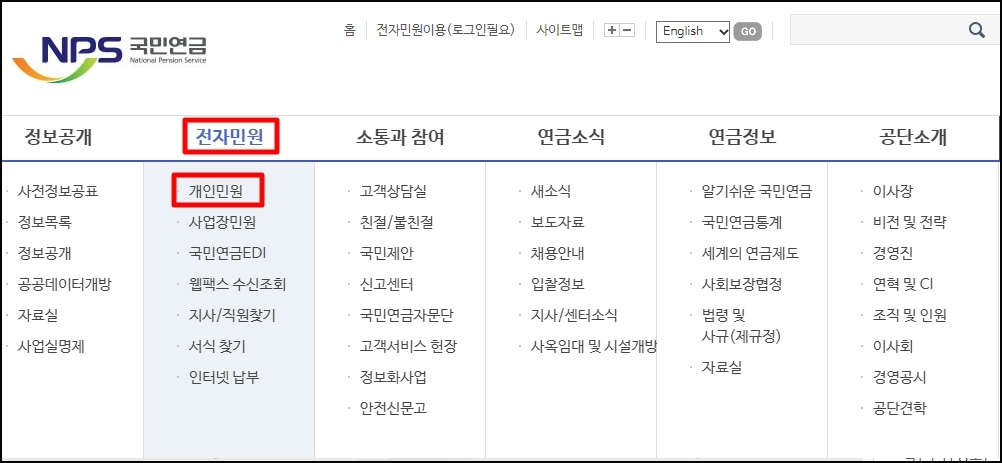 발급을 위해선 먼저 국민연금관리공단 홈페이지로 들어가 상단의 [전자민원] 하위 메뉴에 있는 [개인민원]으로 들어간다.