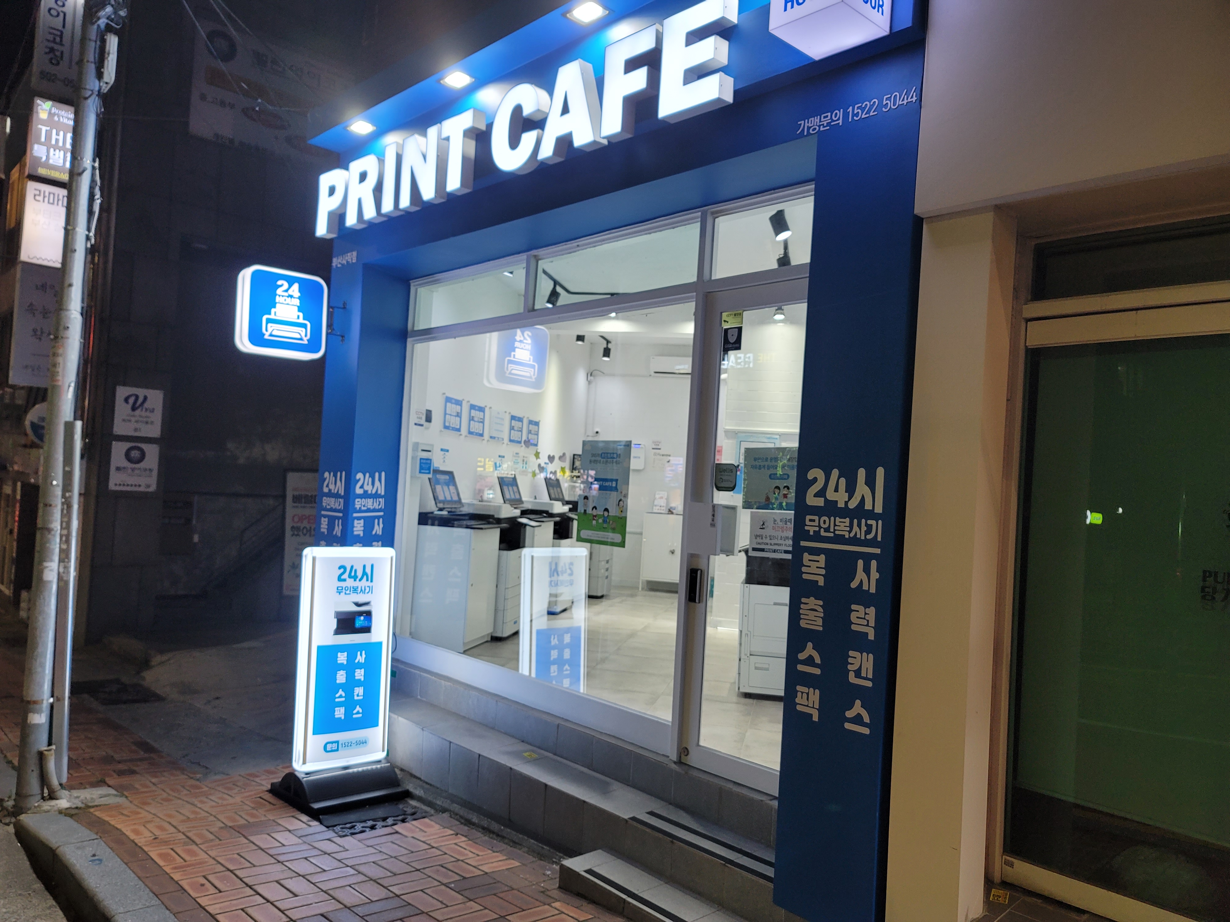 그런데 얼마 전 집 근처를 지나가다 24시 무인 프린트 카페라는 간판을 보게 되었다. 간판은 카페라고 되어있지만 커피나 차를 판매하는 그런 카페가 아니라 인쇄, 복사, 팩스, 스캔 등을 할 수 있는 곳이다. 과거 학교 근처 서점이나 문구점에 가서 눈치 보면서 했던 일들이 이제는 떳떳하게 24시간 할 수 있는 공간이 생긴 것이다.