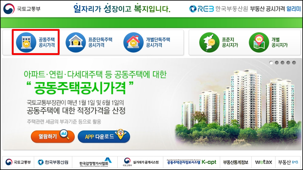 먼저 부동산공시가격 알리미 사이트( www.realtyprice.kr )에 접속하여 왼쪽 상단에 있는 [공동주택 공시 가격]으로 들어간다.