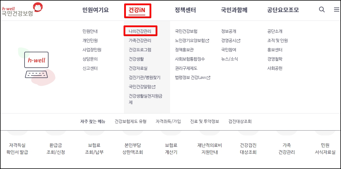 먼저 국민건강보험공단 홈페이지에 접속 후 상단 [건강iN] 하위 메뉴에 있는 [나의건강관리]로 들어간다.