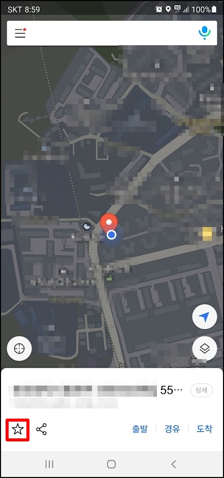 먼저 지도 화면상의 현재 위치를 길게 누르면 하단에 메뉴가 나타나는데 여기에서 별 모양의 아이콘을 선택한다. 별 모양 옆의 공유하기 버튼을 선택하면 카톡이나 문자메시지 등 다양한 방법으로 현재 위치를 다른사람에게 알려줄 수 있다.