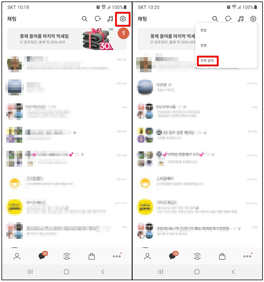 1. 먼저 채팅방 목록 화면 우측 상단의 톱니바퀴 모양 설정을 눌러 [전체 설정]으로 들어간다.