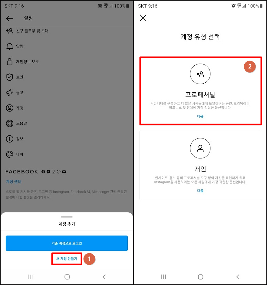 [새 계정 만들기]를 선택한 다음 계정 유형은 프로페셔널을 선택한다.