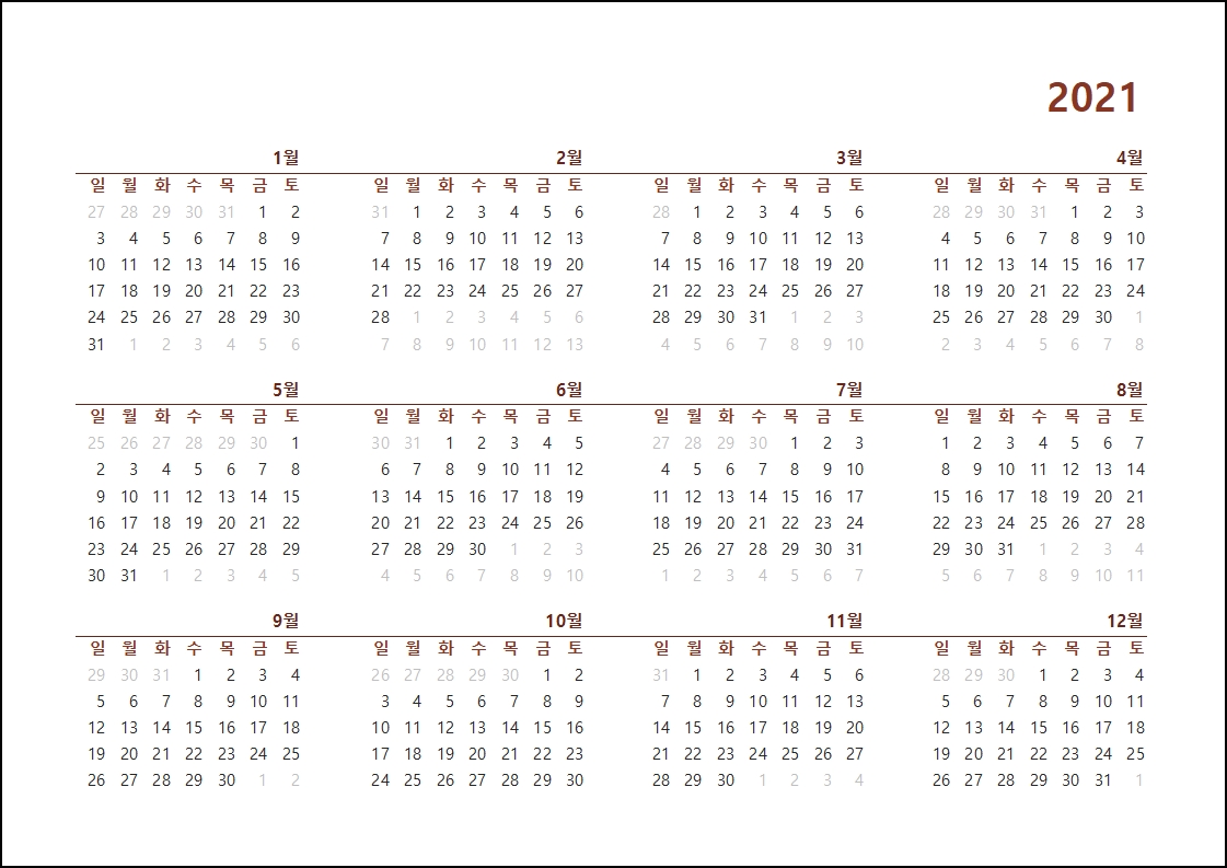 필자의 경우 책상 위 눈에 잘 띄는 곳엔 항상 A4 용지에 출력한 연간 달력이 부착되어 있다. 언제 어디에서 구한 엑셀 파일인지는 모르겠지만 업무 특성상 지나왔던 달과 다가 올 달을 한 눈에 봐야 할 일이 많기 때문에 매년 출력해서 아주 잘 사용하고 있다.