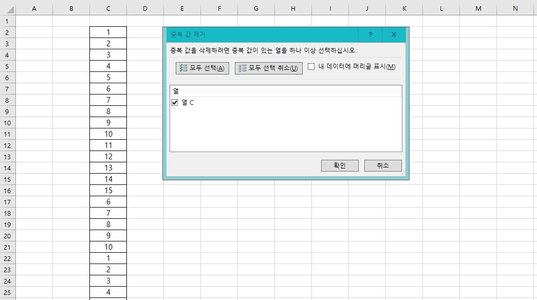3. 성공적으로 중복된 값이 제거되면 중복된 값은 제거되고 몇 개가 남아있는지 확인창이 나타난다.