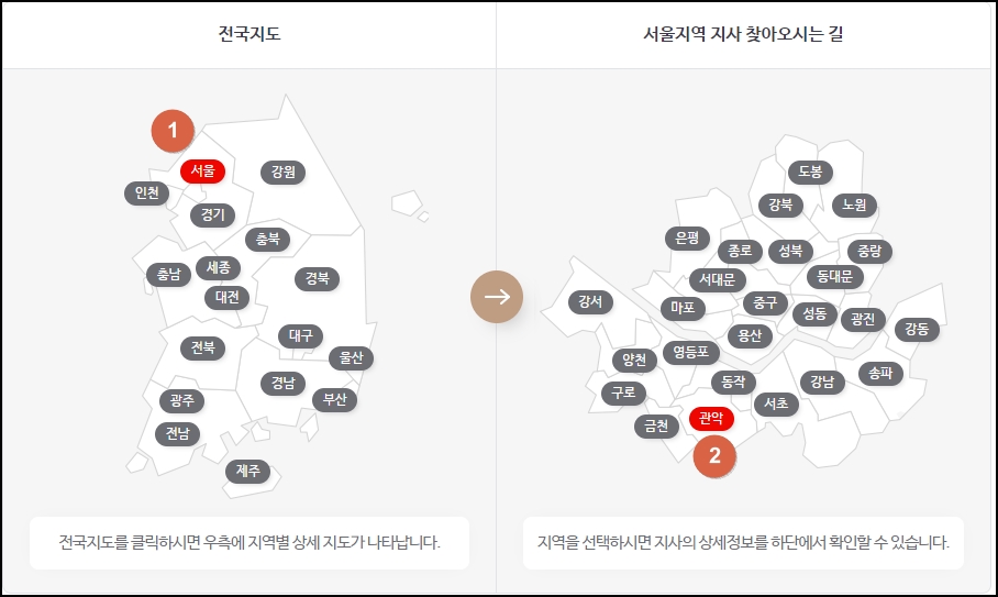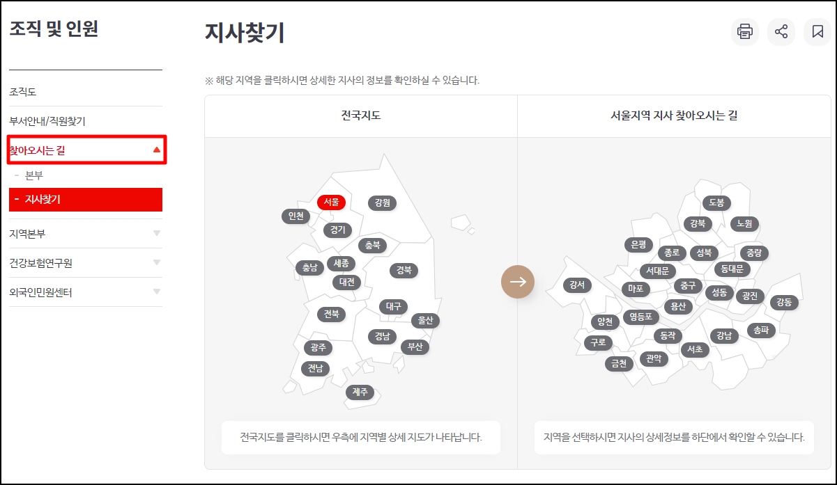 좌측 메뉴의 [찾아오시는 길] 항목에 있는 [지사찾기]로 들어갑니다.
