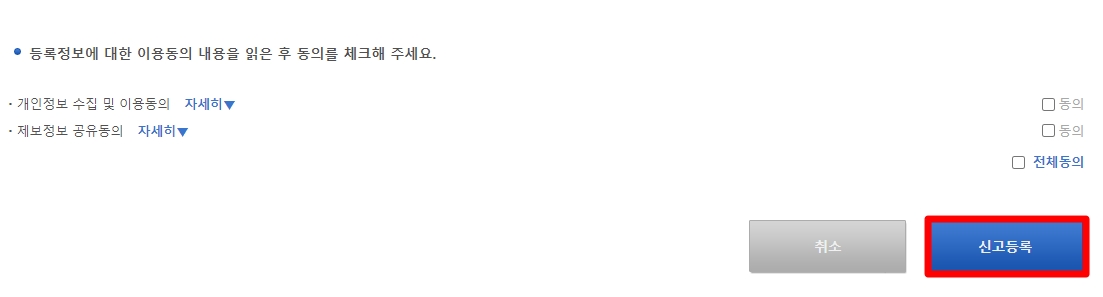 입력이 끝나면 [전체동의]에 체크 후 [신고등록]을 클릭한다.