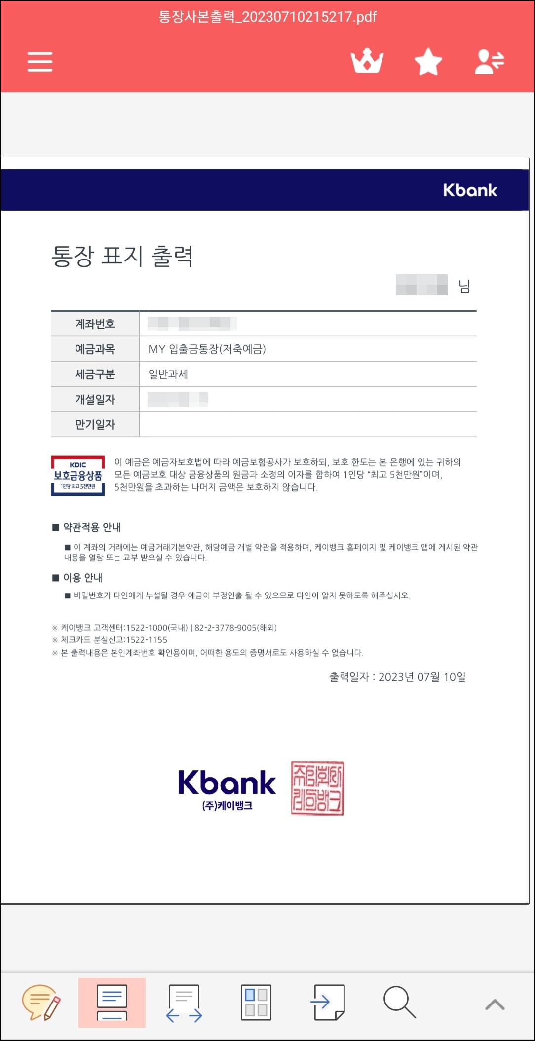 이렇게 통장사본 PDF 파일을 열었다면 이 상태에서 출력을 하거나 PDF 파일 또는 JPG 파일 형태로 저장하여 카카오톡이나 문자메시지, 이메일을 통해 전달을 하면 된다.
