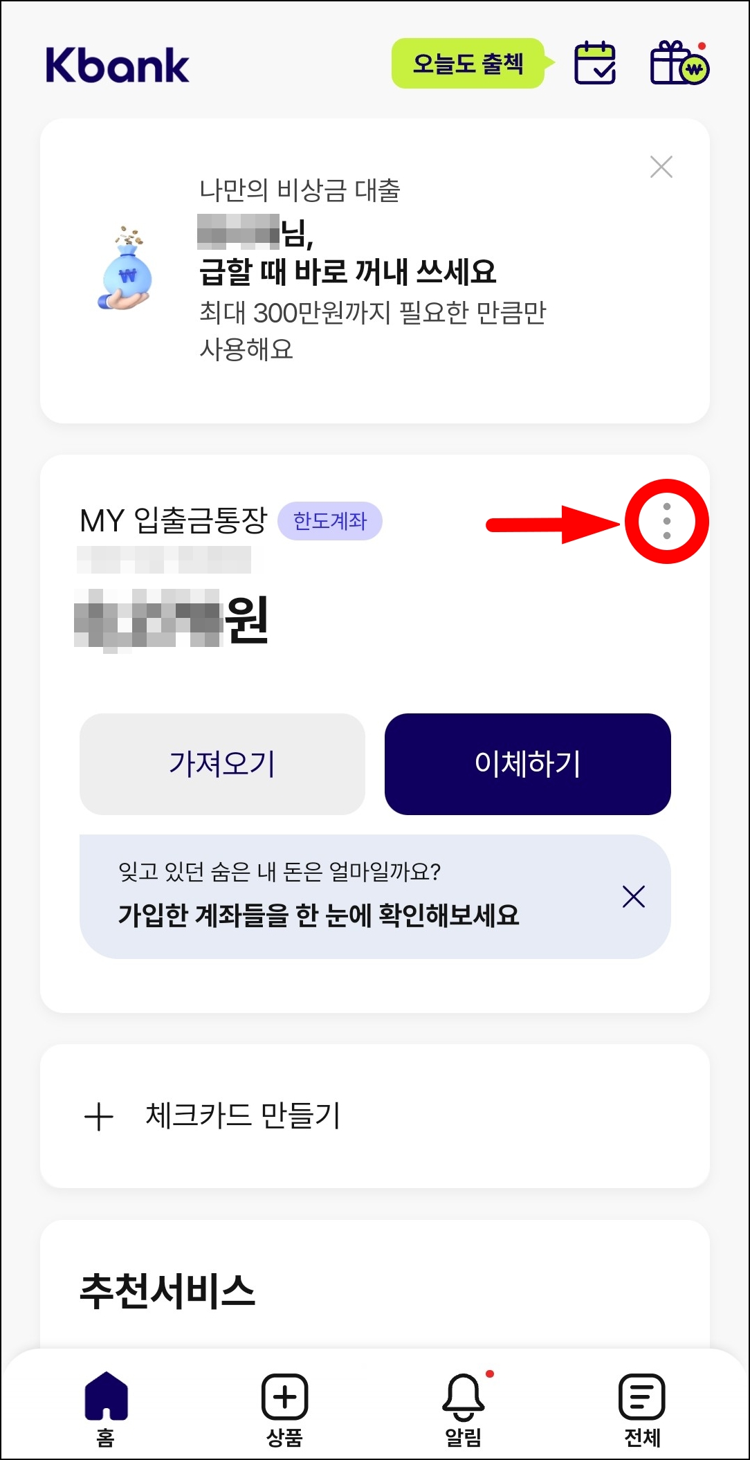 ▼ 먼저 케이뱅크 앱을 열어 통장사본을 출력할 계좌 옆에 있는 점3개를 선택한다.