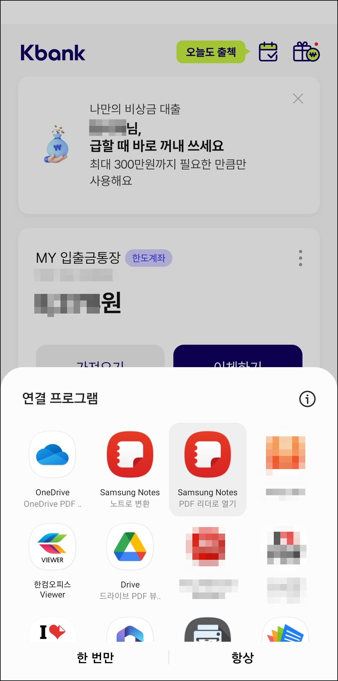 ▼ 케이뱅크 통장사본은 PDF 파일 형식이므로 해당 파일을 열 수 있는 앱을 선택한다.